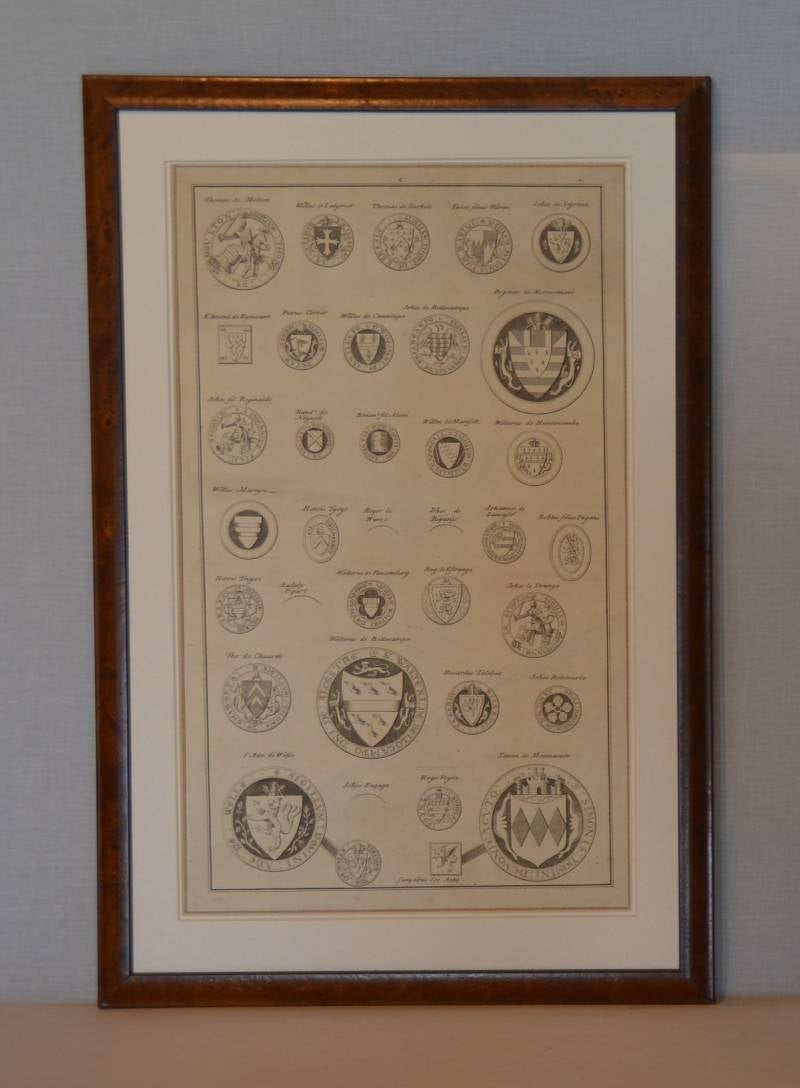 Originele kopergravure. Eind 18° eeuw. Voorbeelden van adellijke "zegels" Dubbele passe-partout, antiek houten lijst.