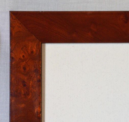 Fijne "marmer" sierboord onder passe-partout, ontspiegeld glas, houten lijst van wortelfineer.