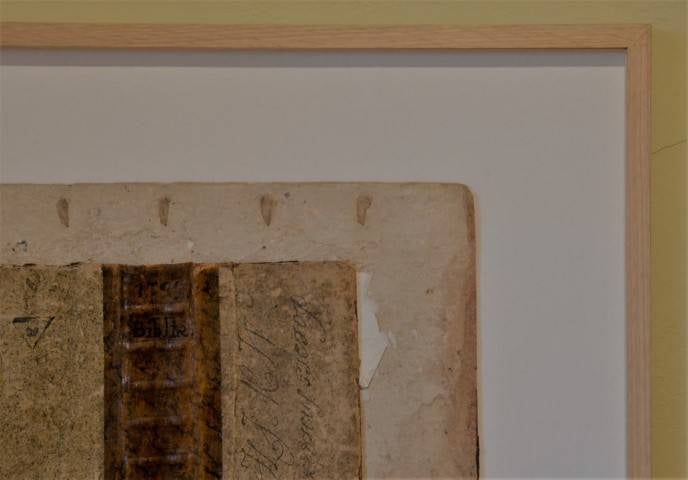 Ingelijste 3D-collage van fragmenten van twee middeleeuwse boekcovers.Blank eikenhouten kader, ontspiegeld glas.