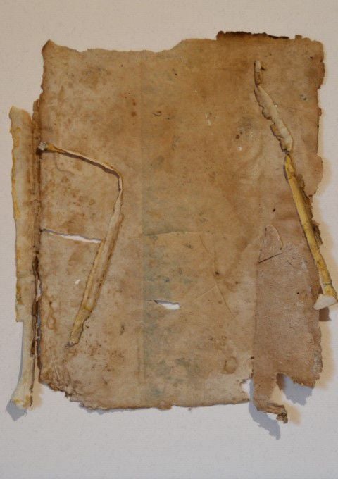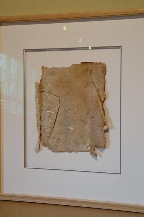 Ingelijste 3D-montage van een origineel schutblad uit een 17°eeuws manuscript.