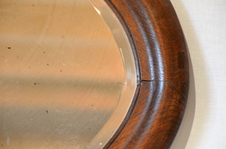 Oude ovale spiegel, schuingeslepen spiegelglas, midddenbruin gebeitste beukenhouten lijst.