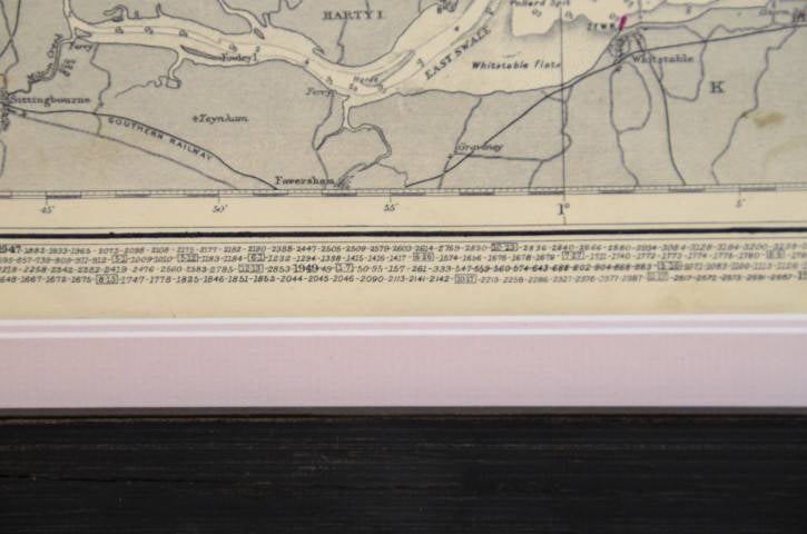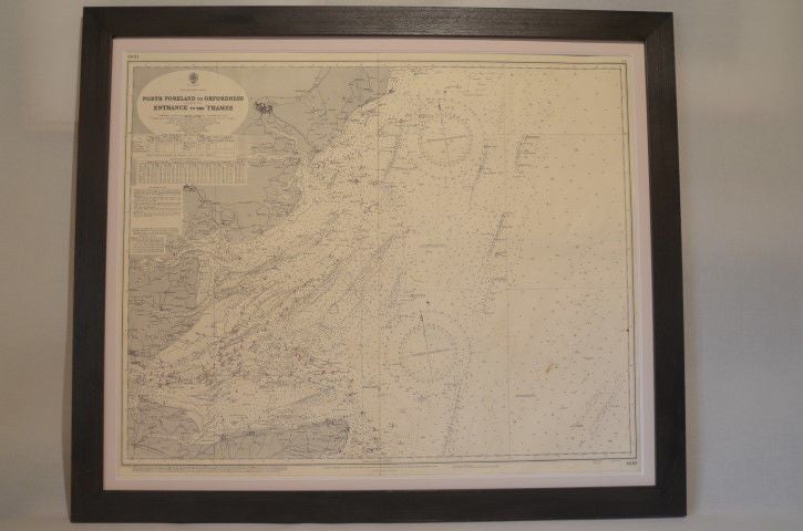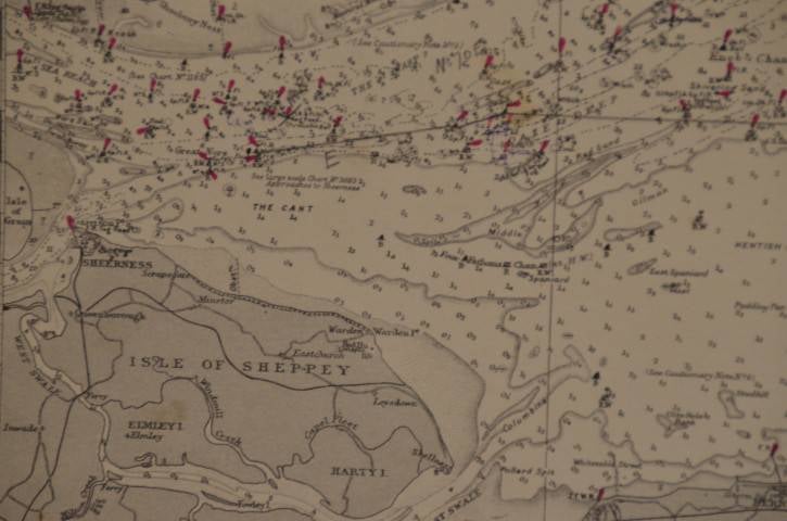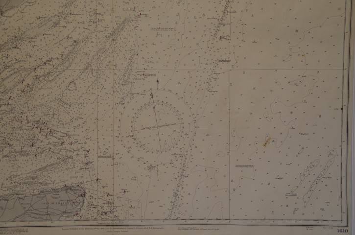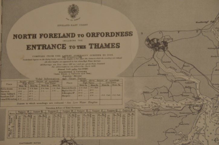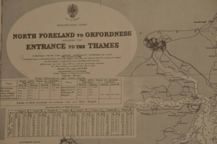 Originele gebruikte kust/zeekaart met aanduidingen van stromingen, getijden, boeien, zandbanken enz.